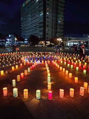 守谷駅西口広場のイルミネーションは近隣の銀行から協賛をいただき、守谷市ネットワーカー連絡協議会(ボランティア団体)が企画から準備、開催、片付けまですべて行っています。