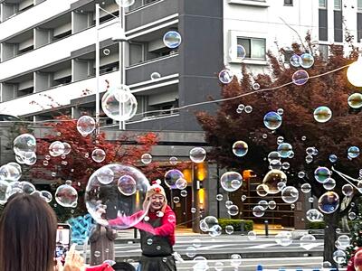 今年初の企画!シャボン玉師hikiさんのシャボン玉ショーはとても綺麗で、駅を利用している人たちにも大好評でした。