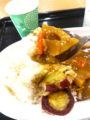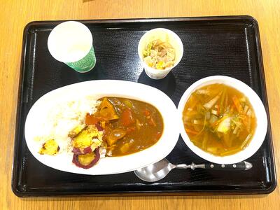 本日のカレーとみそ汁。レンコンサラダやさつま芋のバター焼きも。